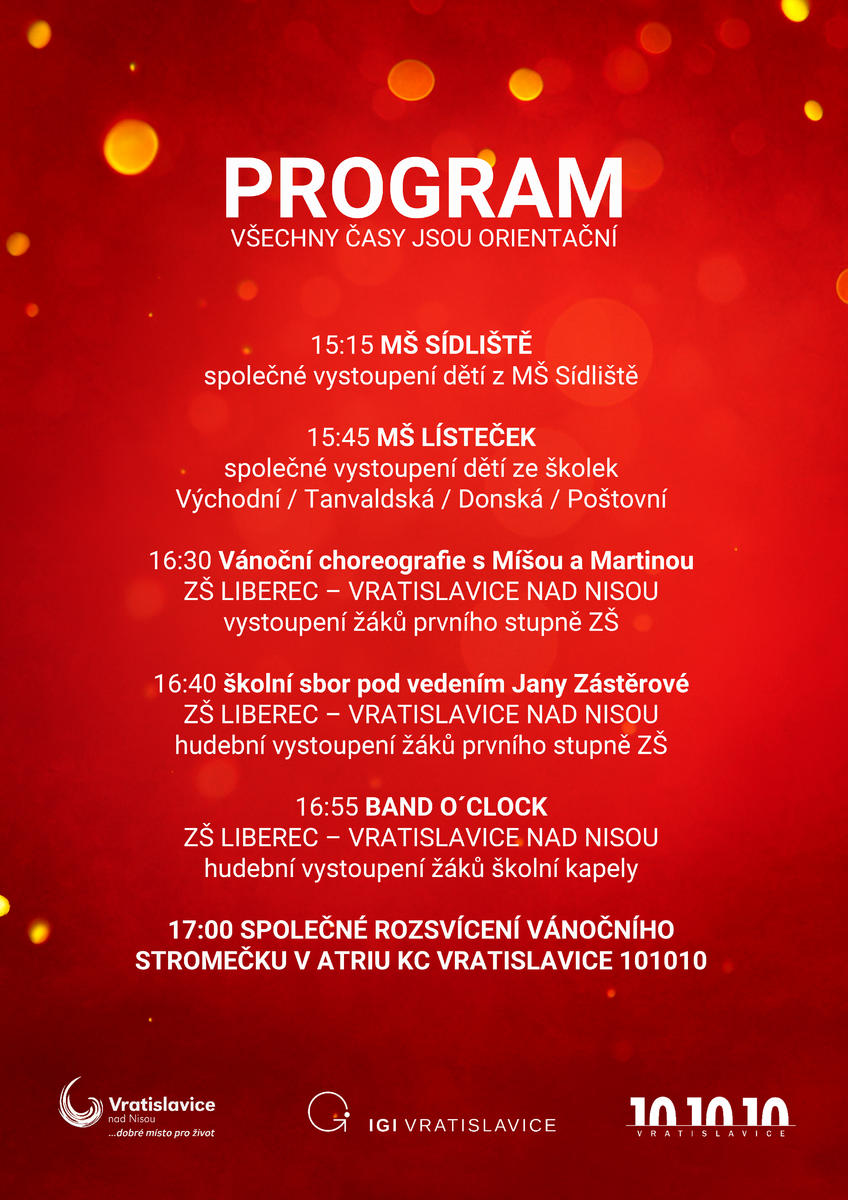 V sobotu 29. listopadu od 15 do 18 hodin vás zveme na rozsvícení vánočního stromečku v atriu Kulturního centra VRATISLAVICE 101010 a ve spolupráci s IGI VRATISLAVICE.