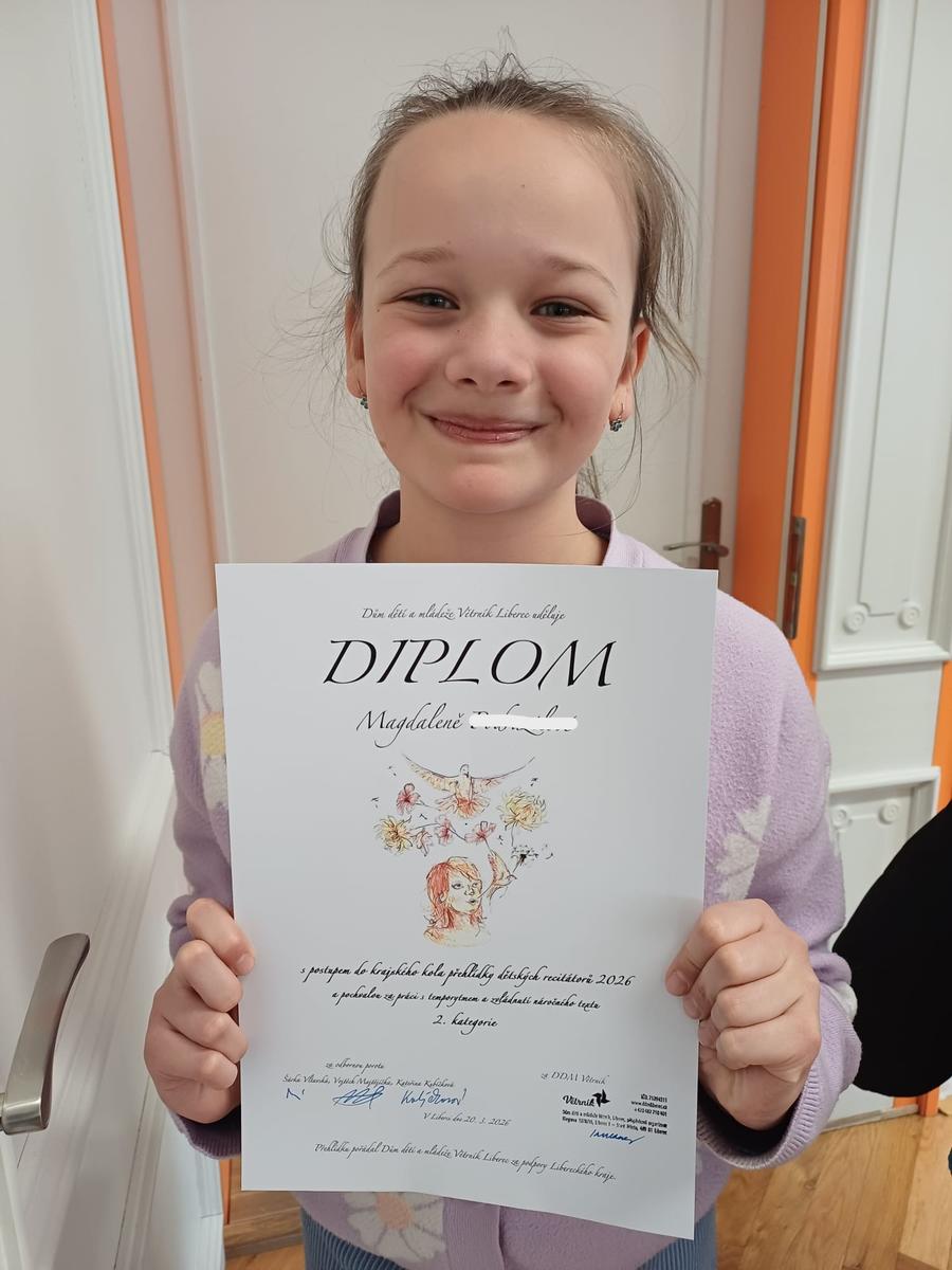 Naše žákyně z 5. A nás potěšila krásným úspěchem v okresním kole přehlídky dětských recitátorů 2026, kde svým citlivým přednesem zaujala porotu, zvítězila a postoupila do krajského kola. Magdalence srdečně gratulujeme, děkujeme za nádhernou reprezentaci naší školy a přejeme jí mnoho štěstí v dalším kole.